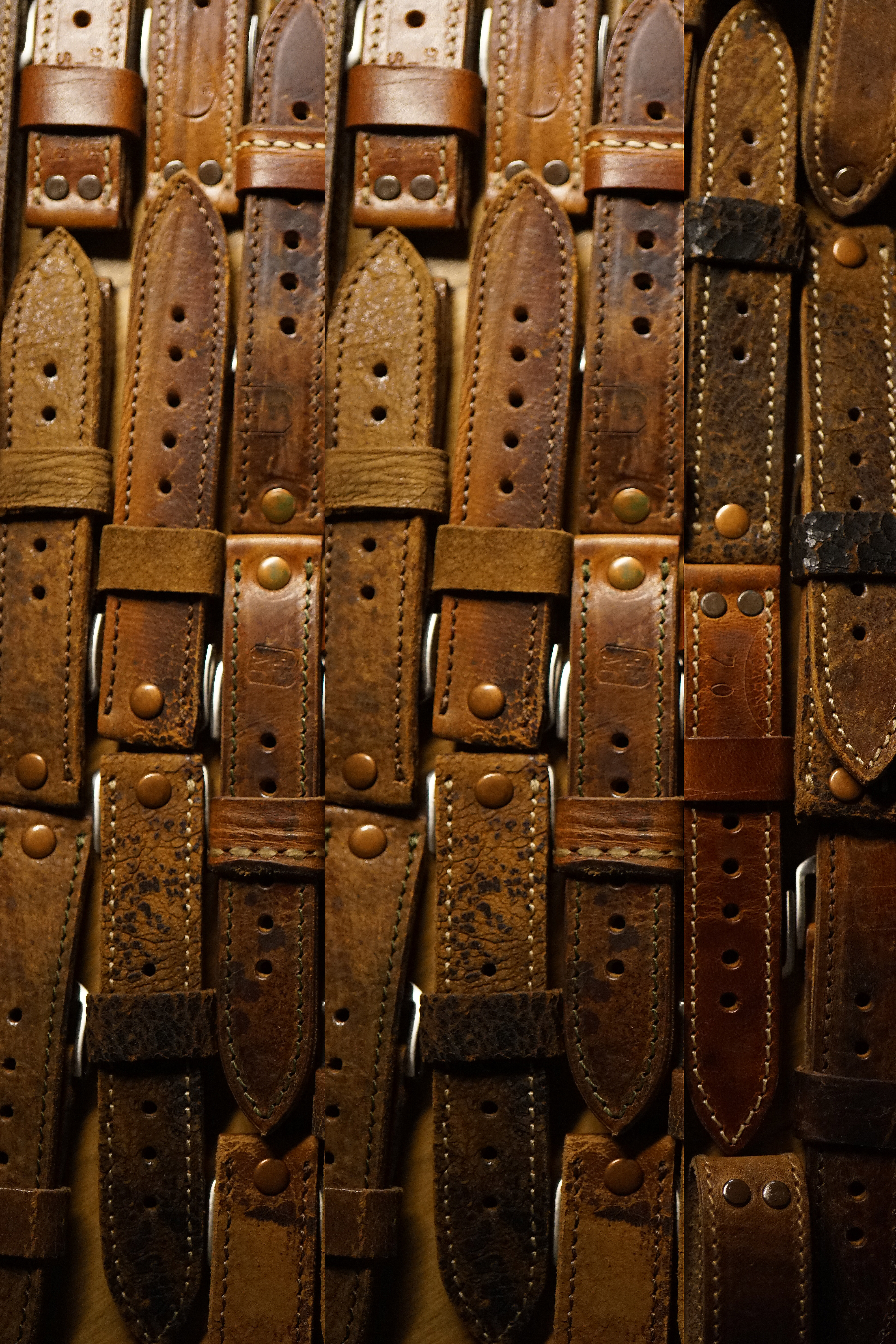 由於使用古董彈藥袋皮料製作,每一條錶帶的顏色、紋理、都不相同、因設計需求丁扣有兩個的也有一個的也有可能沒有、也不是每一條錶帶都有駐地章或生產章、且都可能有使用痕跡。